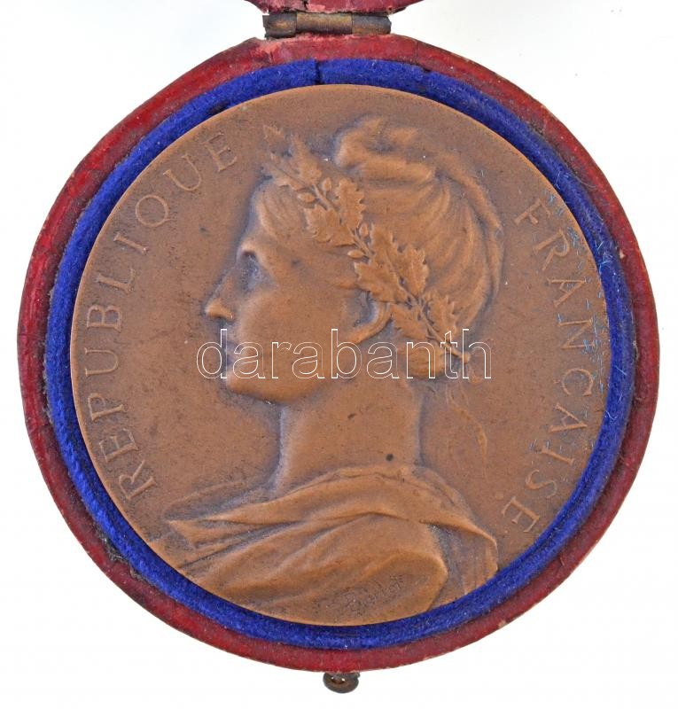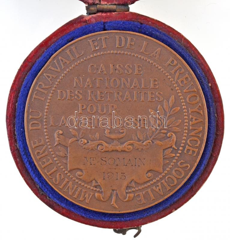 Franciaország 1913. "Francia Köztársaság / Munka és Szociális Jóléti Minisztérium - Nemzeti Öregségi Nyugdíjpénztár" Br emlékérem, hátoldala gravírozva "Mr. Somain 1915", eredeti tokban. Szign.: A. Borrel (68,90g/50mm) T:1- ph. / France 1913. "République Francaise / Ministere du Travail et de la Prevoyance Sociale - Caisse Nationale des Retraites pour la Vieillesse" Br commemorative medallion, reverse engraved "Mr. Somain 1915", in original case. Sign.: A. Borrel (68,90g/50mm) C:AU edge error