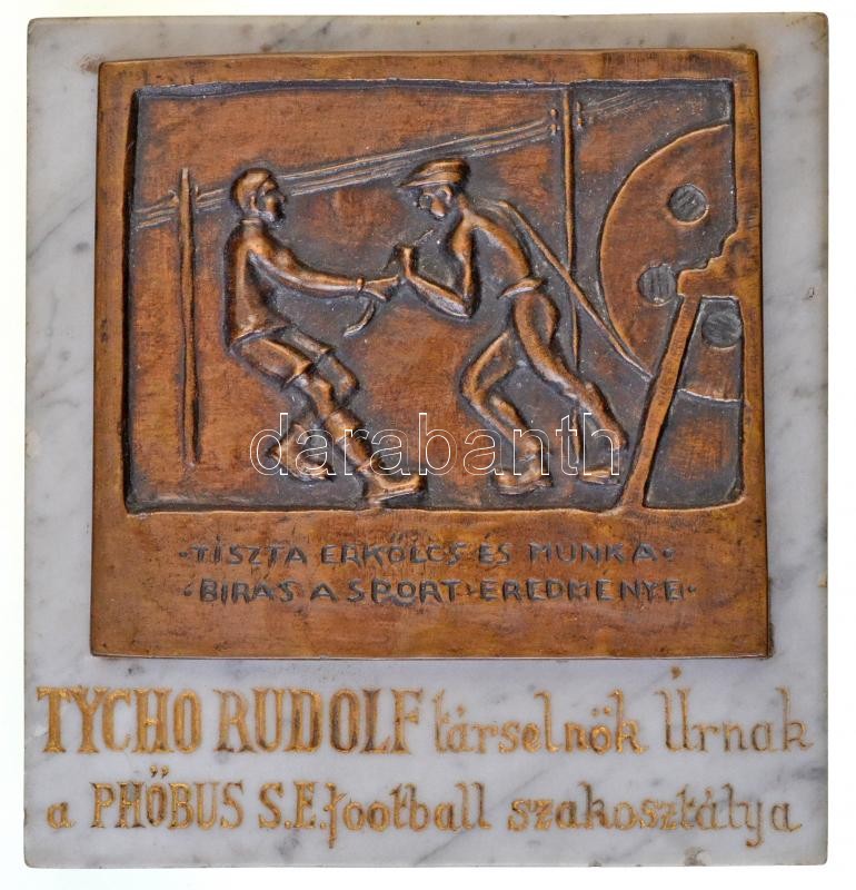 1932-1950. "Tiszta erkölcs és munka-bírás a sport eredménye" Br plakett, márványlapra erősítve, rajta "Tycho Rudolf társelnök Úrnak a Phöbus S.E. football szakosztálya" felirattal (2010g/162x171mm) T:2 / Hungary 1932-1950. "Tiszta erkölcs és munka-bírás a sport eredménye (Pure Moral and Workload bearing are the result of Sport)" Br plaque fastened on marble sheet, with "Tycho Rudolf társelnök Úrnak a Phöbus S.E. football szakosztálya (For Co-President Mr. Rudolf Tycho from the Phöbus S.E.'s Football Section)" inscription (2010g/162x171mm) C:XF