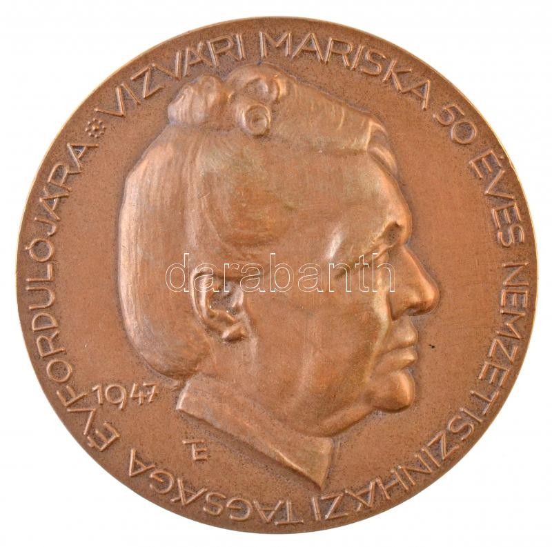 Telcs Ede (1872-1948) 1947. "Vízvári Mariska 50 éves nemzetiszínházi tagsága évfordulójára / A Magyar Vallás és Közoktatásügyi Miniszter" Br emlékérem (110,04g/58mm) T:2 / Hungary 1947. "To Mariska Vízvári, for 50th Anniversary of the National Theatre Membership / The Hungarian Minister of Religion and Education" Br commemorative medal. Sign.: Ede Telcs (110,04g/58mm) C:XF