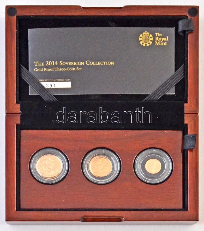 Nagy-Britannia 2014. 1/4 Sovereign Au (1,99g/0.916) + 1/2 Sovereign Au (3,99g/0.916) + 1 Sovereign Au "II. Erzsébet" (7,98g/0.916) mindhárom eredeti, gyűjtői díszdobozban, tanúsítvánnyal és leírással T:PP