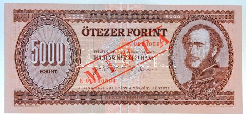 1993. 5000Ft piros "MINTA" felülnyomással és perforációval, "K 00000504" sorszámmal T:I