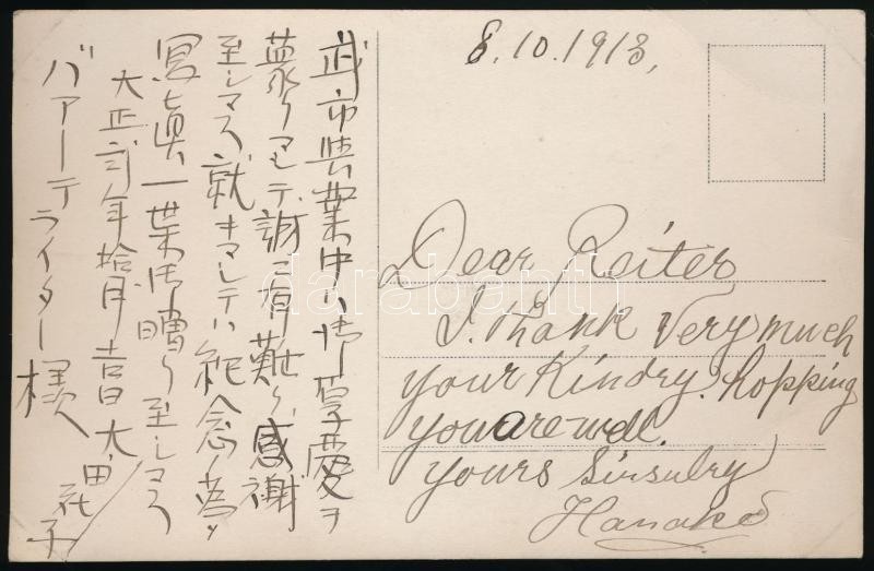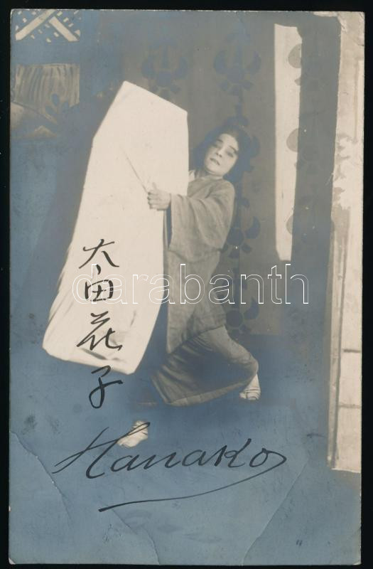 1913 Hisa Ota "Hanako" (1868-1945) japán színésznő üdvözlő sorai és aláírása őt magát ábrázoló fotólapon /