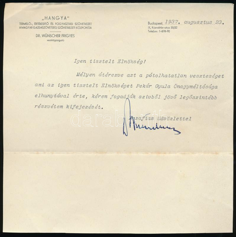 Leírás: 1937 Bp., A Hangya Szövetkezet vezérigazgatójának, Dr. Wünscher Frigyes aláírása fejléces levélpapíron