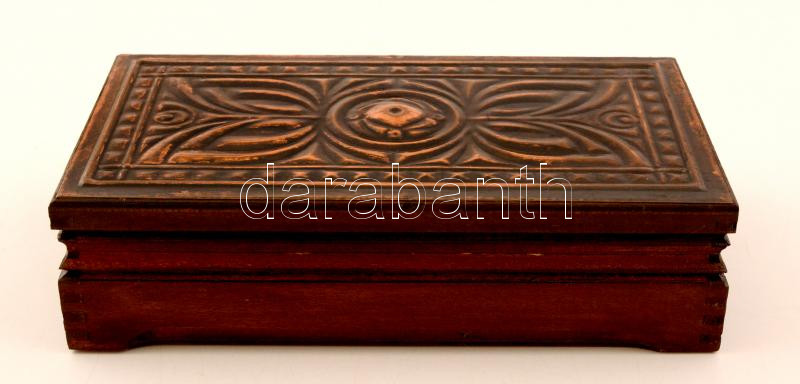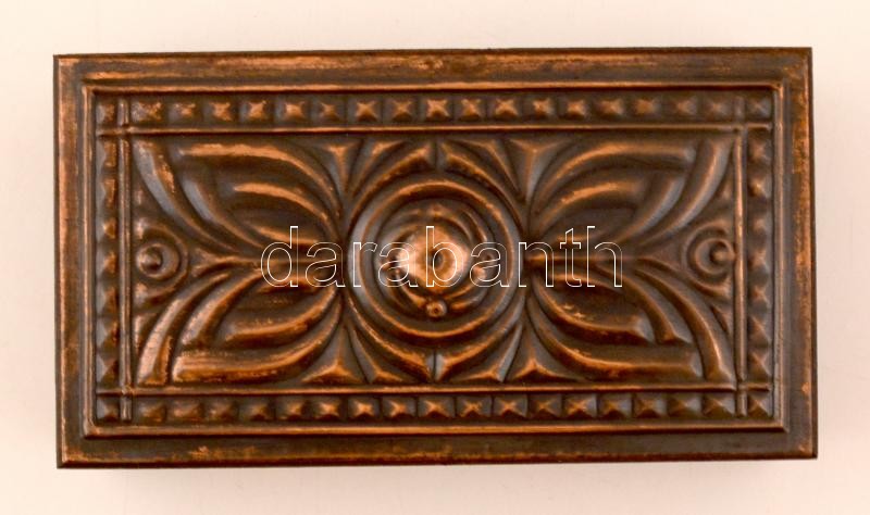 Leírás: Igényes fa doboz, díszes réz rátéttel a fedélen, kisebb hibával, de alapvetően jó állapotban, 11.5x21x5x6 cm.