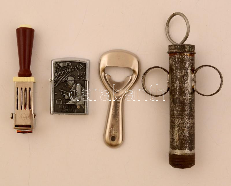 Leírás: Kis vegyes bolha tétel: bélyegző (nem működik), feliratos fém sörnyitó, hadikölcsönt népszerűsítő öngyújtó (működik), pumpa (beöntéshez?)