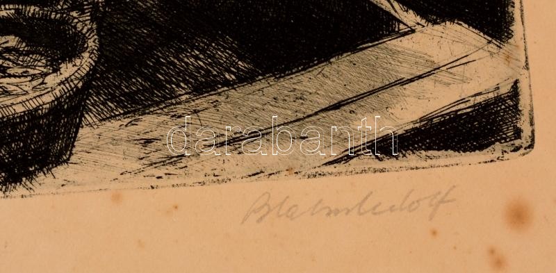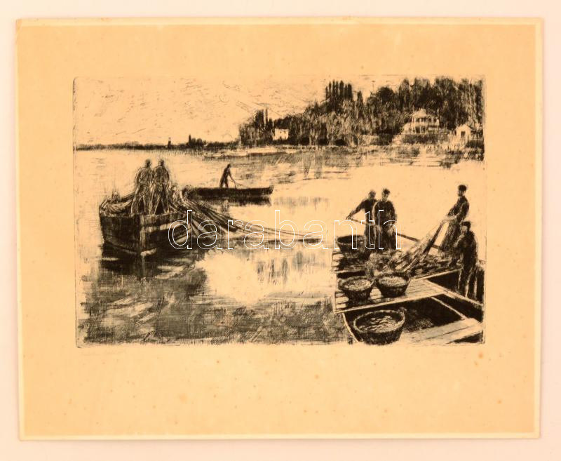 Leírás: Blahos Rudolf (1917-1986): Balatoni halászok. Rézkarc, karton, jelzett, foltos, 27×37 cm