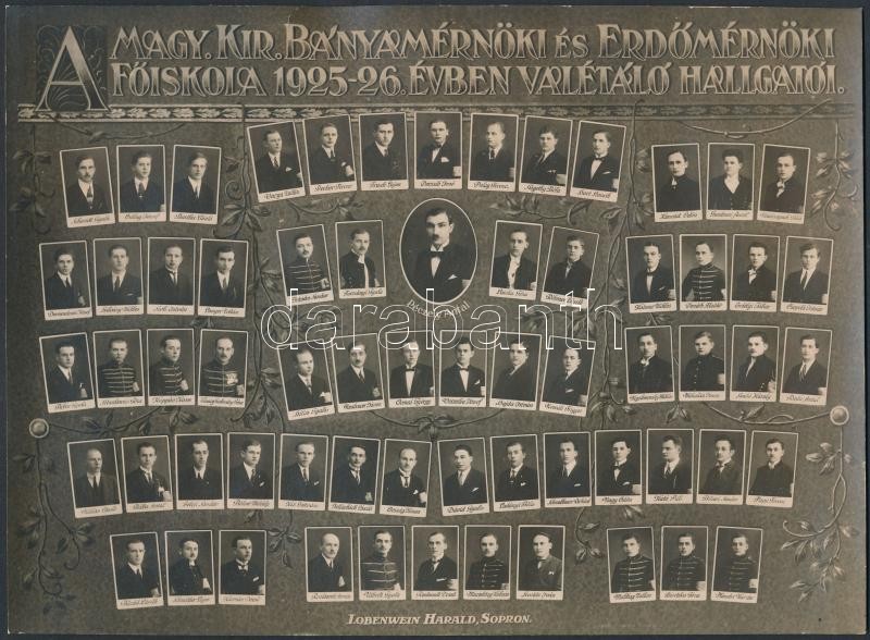Leírás: 1926 A magyar királyi bányamérnöki és erdőmérnöki főiskola valétáló hallgatói, tablókép, Lobenwein Harald soproni műterméből, 17×23 cm