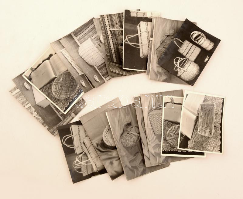 Leírás: 1955 Budapesti Kosárfonó Kisipari Szövetkezet 22 darab kosár modell fotó, feliratozva. Láng Pál tervei. 13x9 cm