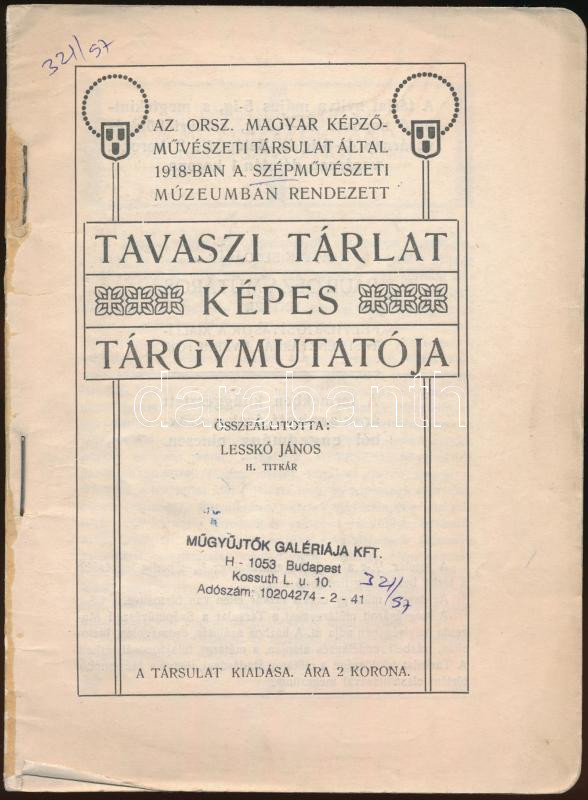 1918Tavaszi tárlat képes tárgymutatója. Szerk.: Lesskó János. Budapest, 1918, Országos Magyar Képzőművészeti Társulat. Kiadói papírkötés, fekete-fehér fotókkal. A borító leszakadt a könyvtestről, de a könyv egyben van.