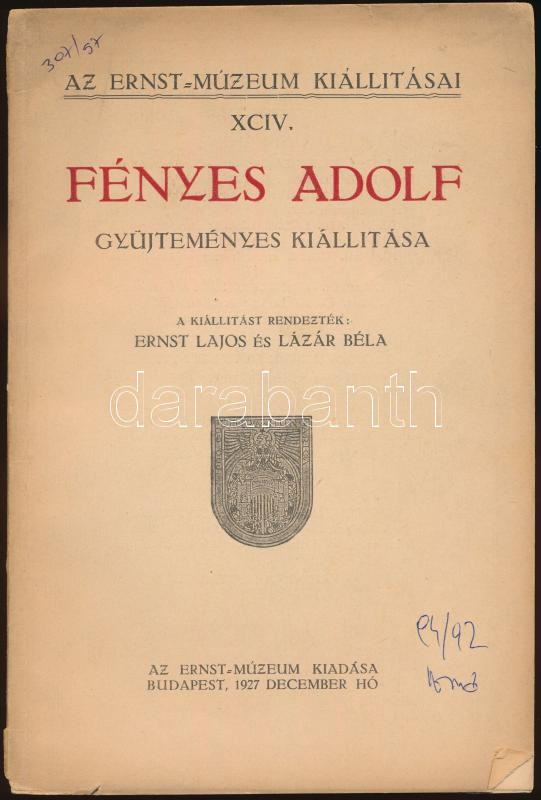 1927 Fényes Adolf gyűjteményes kiállítása. A kiállítást rendezték Ernst Lajos és Lázár Béla. Ernst-Múzeum kiállításai XCIV. Budapest, 1927, Ernst-Múzeum. Kiadói papírkötés, fekete-fehér illusztrációkkal. Jó állapotban.