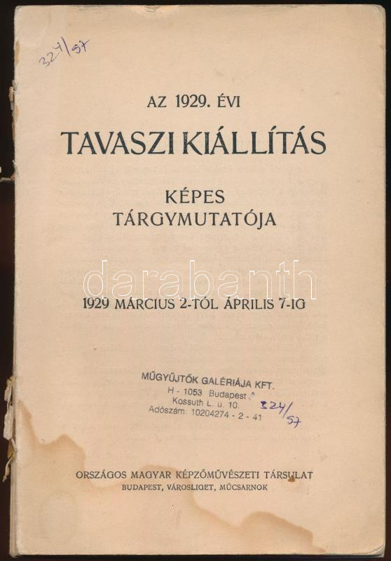1929 Tavaszi kiállítás képes tárgymutatója. Budapest, Országos Magyar Képzőművészeti Társulat. Kiadói papírkötés, számos fotóval illusztrálva. Megviselt állapotban, a borítója leszakadt a könyvtestről, foltos.