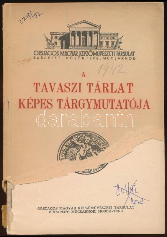 1942 Tavaszi tárlat képes tárgymutatója. Budapest, 1942, Országos Magyar Képzőművészeti Társulat. Kiadói papírkötés, fekete-fehér fotóval, a borítója szakadt, hiányos, a borító elvált a gerinctől, de a könyvtest egyben van, ceruzás bejegyzésekkel.