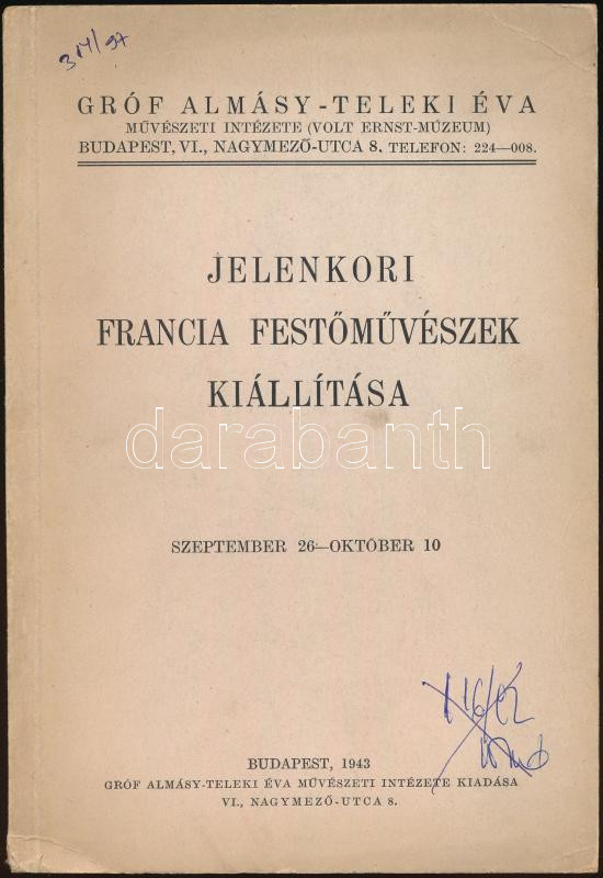 1943 Jelenkori francia festőművészek kiállítása. Budapest, 1943, Gróf Almásy-Teleki Éva Intézete. Kiadói papírkötés, fekete-fehér fotókkal illusztrálva. Jó állapotban.