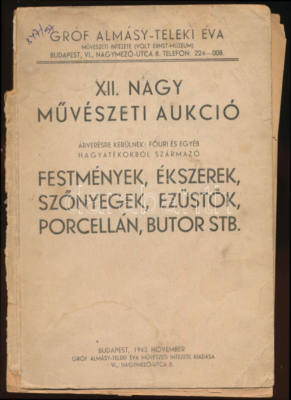 1943 XII. Nagy Művészeti Aukció. Budapest, 1943, Gróf Almásy-Teleki Éva Művészeti Intézete. Kiadói papÃrkötés, megviselt állapotban, a borÃtója leszakadt a könyvtestrÅ‘l, egy lap elvált a könyvtestrÅ‘l, fekete-fehér fotókkal illusztrálva.