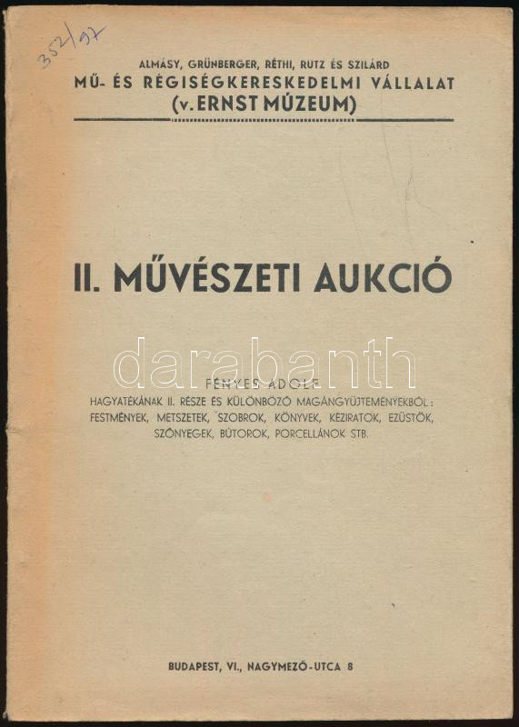 1946 II. Művészeti Aukció. Fényes Adolf hagyatékának II. része és különböző magángyűjteményekből: festmények, metszetek, szobrok, könyvek, kéziratok, ezüstök, szőnyegek, bútorok, porcellánok. Budapest, 1946, Mű és Régiségkereskedelmi Vállalat. Kiadói papírkötés, ceruzás bejegyzésekkel, egyébként jó állapotban.