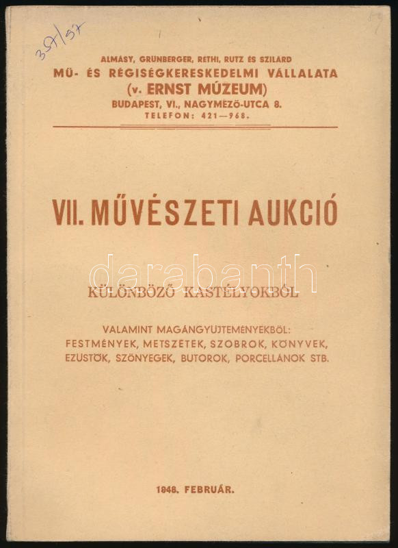 1948 VII. Művészeti Aukció. Különböző kastélyokból, valamint magángyűjteményekből: festmények, metszetek, szobrok, könyvek, kéziratok, ezüstök, szőnyegek, bútorok, porcellánok...stb. Budapest, 1948, Mű és Régiségkereskedelmi Vállalat. Kiadói papírkötés, egy-két ceruzás bejegyzéssel, egyébként jó állapotban.
