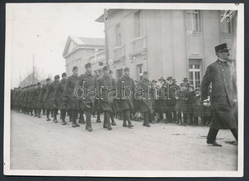 Leírás: Csanády főhadnagy századot vezet, fotó, hátulján feliratozva, 8,5×12 cm