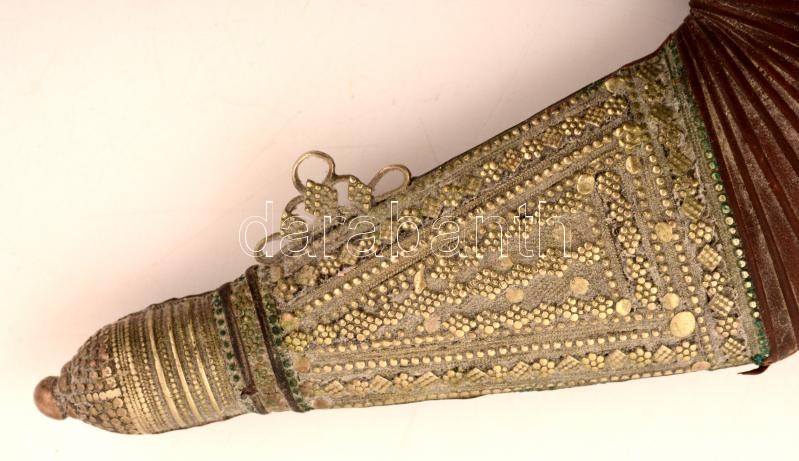 Díszes handzsár tőr, bőr borítású fa hüvellyel, fém rátétekkel, pengehossz: 21 cm, teljes hossz: 32 cm /