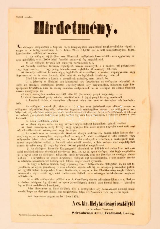 1855 Sopron, előfogati szolgálatra vonatkozó rendelet két nyelven. 52x... https://www.darabanth.com/hu/280-Gyorsarveres/280.0/Festmeny-mutargy-papirregiseg-egyeb/Nyomtatvanyok~43/1855-Sopron-elofogati-szolgalatra-vonatkozo-rendelet-ket-nyelven-52x38-cm~II1443844
