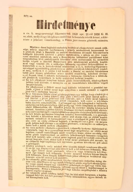 1859 Dunai gőzhajózás kitérési és hangjelzéseire vonatkozó új rendelet nagyalakú hirdetménye, magyar és német nyelven /