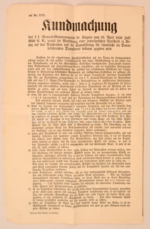 1859 Steam shipping on the Danube. New regulations regarding taking over and signals. Large poster in German and Hungarian. 62x48 cm
