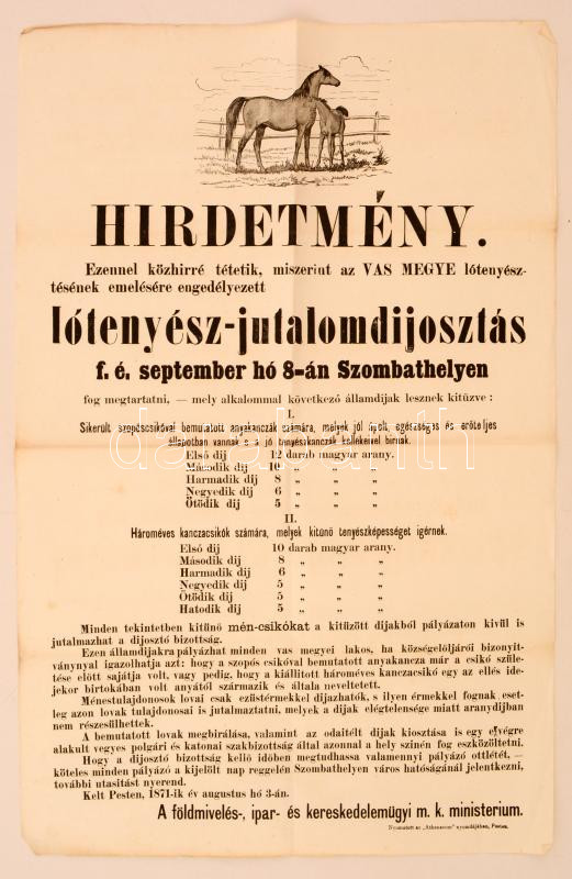 Leírás: 1871 Lótenyész jutalomdíjosztás, Szombathely hirdetmény 32x48 cm
