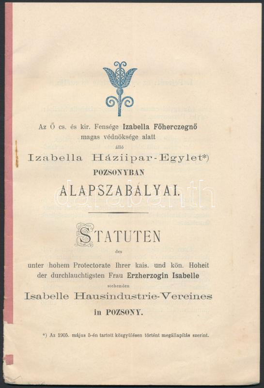 1905 Pozsony, Az Izabella Háziipari-Egylet alapszabályai, magyar és né... https://www.darabanth.com/hu/280-Gyorsarveres/280.0/Festmeny-mutargy-papirregiseg-egyeb/Nyomtatvanyok~43/1905-Pozsony-Az-Izabella-Haziipari-Egylet-alapszabalyai-magyar-es-nemet-nyelven-29p~II1445144