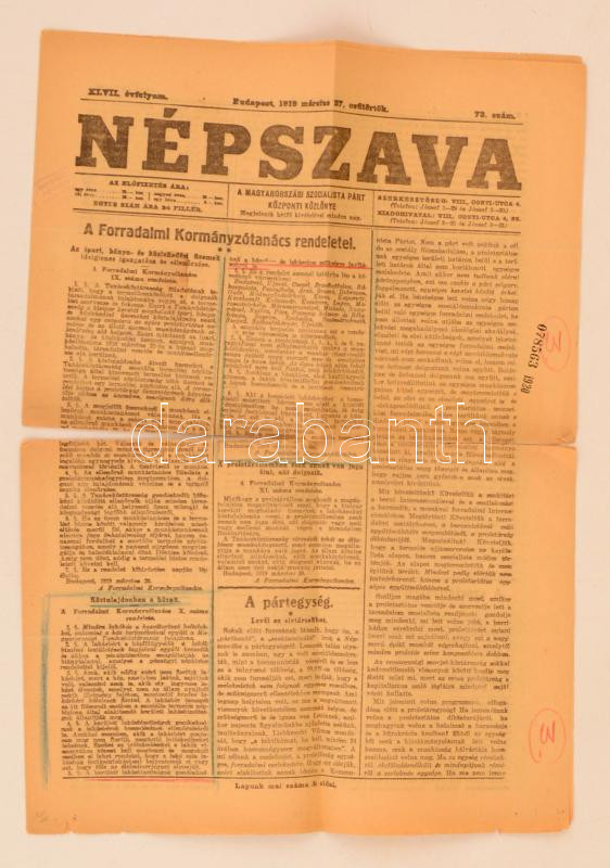 1919 a Népszava márc. 27-i lapszáma, érdekes írásokkal https://www.darabanth.com/hu/280-Gyorsarveres/280.0/Festmeny-mutargy-papirregiseg-egyeb/Nyomtatvanyok~43/1919-a-Nepszava-marc-27-i-lapszama-erdekes-irasokkal~II1440971