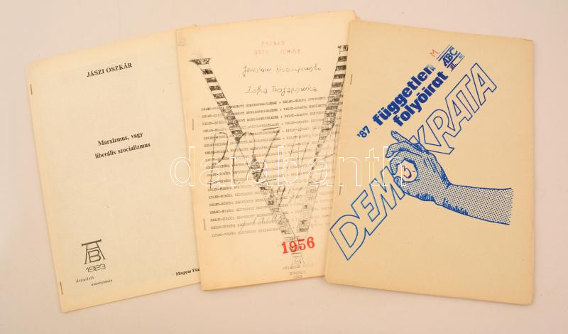 1983-87 Szamizdat nyomtatványok, 4 db: 1983 Jászi Oszkár: Marxizmus, vagy liberális szocializmus. Magyar füzetek könyve. Budapest, 1983, Független kiadó. Kiadói tűzött papírkötés. 1983 Poznan, 1956. június. Kelet-Európa elnyomott munkásfelkelései. Budapest, 1983, Független Kiadó. Kiadói tűzött papírkötés. 1983 Random-Ursus 1976. Kelet-Európa elnyomott munkásfelkelései. Budapest, 1983, Független Kiadó. Kiadói tűzött papírkötés. 1987 Demokrata, független folyóirat, 1987 3 szám. Kiadói papírkötés.