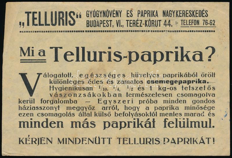 Leírás: cca 1920-1930 "Tellurius" Gyógynövény és Paprika Nagykereskedés szórólapja