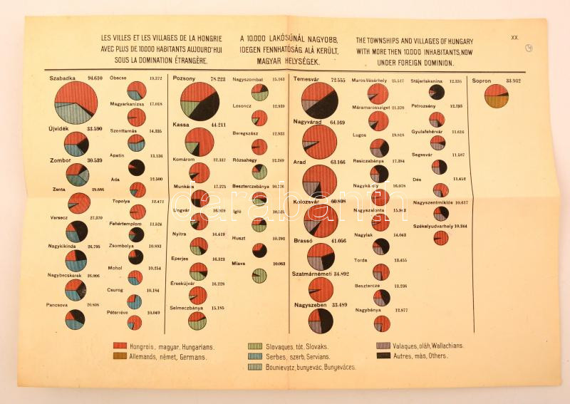 Leírás: cca 1920 A 10.000 lakosnál nagyobb idegen fennhatóság alá került magyar helységek, statisztika, 20. sz. melléklet