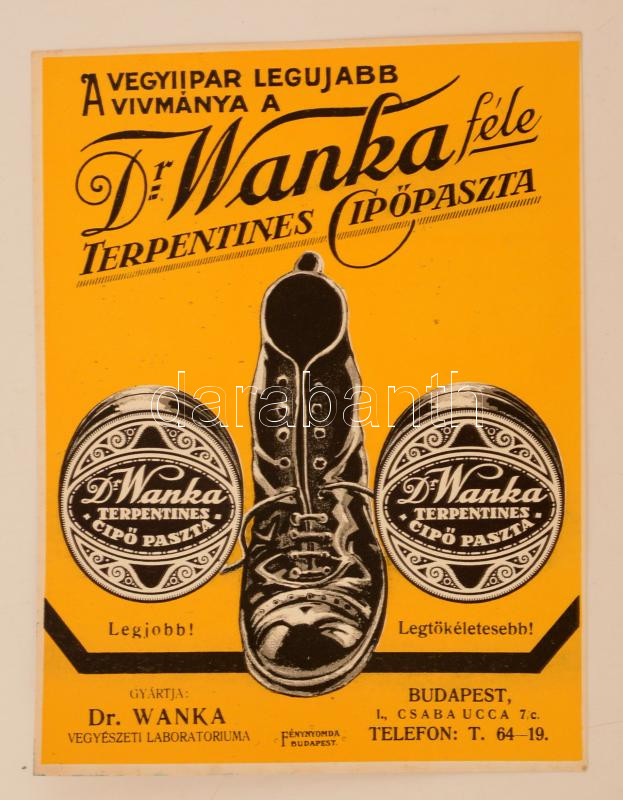 cca 1920 Dr. Wanka féle cipőpaszta karton kisplakát. 19x24 cm https://www.darabanth.com/hu/280-Gyorsarveres/280.0/Festmeny-mutargy-papirregiseg-egyeb/Nyomtatvanyok~43/cca-1920-Dr-Wanka-fele-cipopaszta-karton-kisplakat-19x24-cm~II1445604