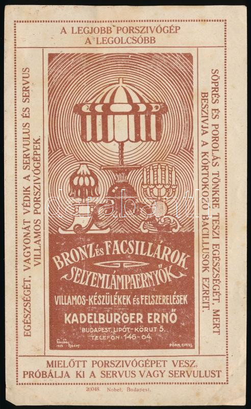 Leírás: cca 1923 Bp., Kadelburger Ernő Bronz és Facsillárok, Selyemlámpaernyők, Villamoskészülékek és felszerelések kereskedésének szórólapja