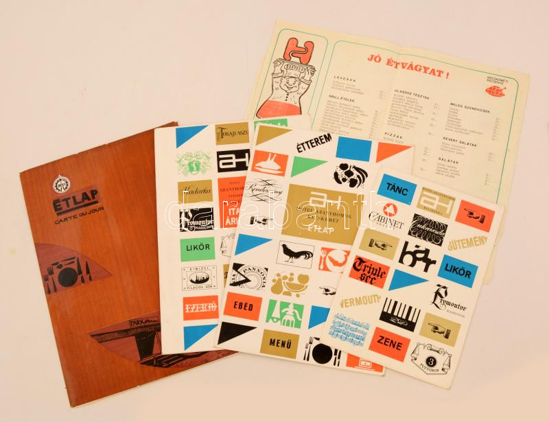 Leírás: cca 1960-1990 6 db kecskeméti étterem étlapja, különböző méretben