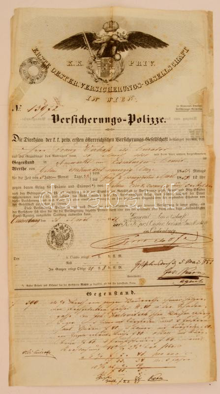 1851 Az Első Osztrák Biztosítótársaság biztosítási kötvénye jó állapotban 3kr okirati szignettával / Insurance bond of the First Austrian Insurance Co.