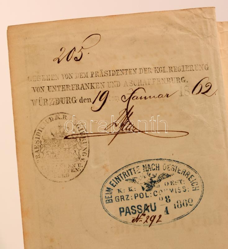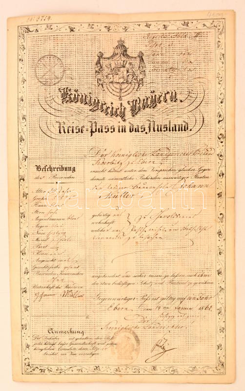 1862 Ebern, A Bajor Királyság útlevele külföldre / Königreich Bayern R... https://www.darabanth.com/hu/280-Gyorsarveres/280.0/Festmeny-mutargy-papirregiseg-egyeb/Okmanyok~16/1862-Ebern-A-Bajor-Kiralysag-utlevele-kulfoldre-Konigreich-Bayern-Reisepass-passport~II1444934