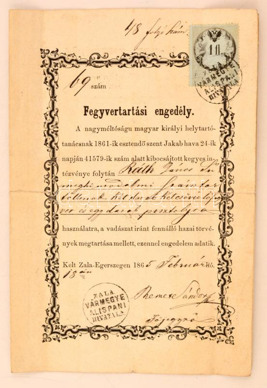 1865 Fegyvertartási engedély és lőporengedély / 1865 Gun and powder li... https://www.darabanth.com/hu/280-Gyorsarveres/280.0/Festmeny-mutargy-papirregiseg-egyeb/Okmanyok~16/1865-Fegyvertartasi-engedely-es-loporengedely-1865-Gun-and-powder-licence~II1443647