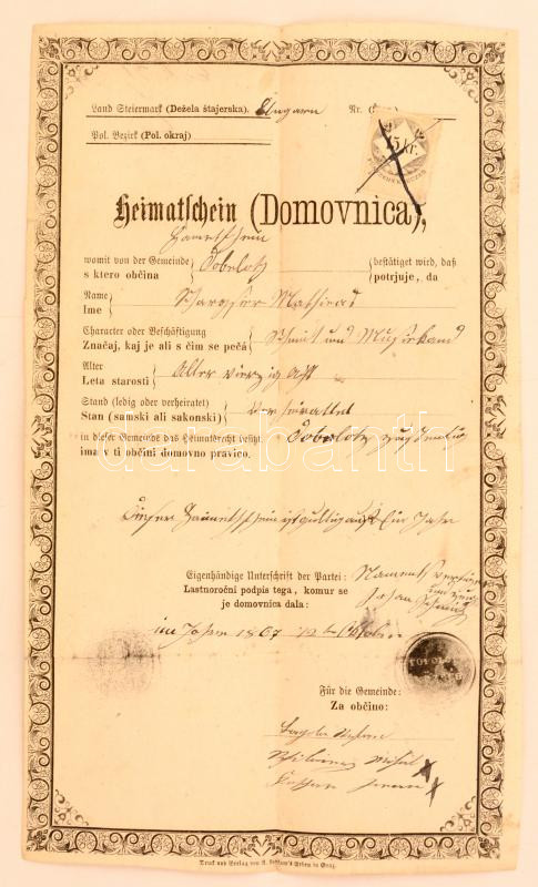 1867 Horvát nyelvű illetőségi igazolás / Croatian home-id. https://www.darabanth.com/hu/280-Gyorsarveres/280.0/Festmeny-mutargy-papirregiseg-egyeb/Okmanyok~16/1867-Horvat-nyelvu-illetosegi-igazolas-Croatian-home-id~II1444624