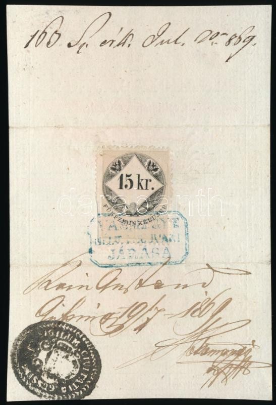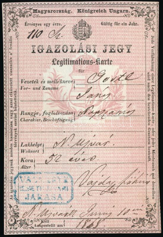 Leírás: 1868 Németújvár, Kétnyelvű igazolási jegy, hátoldalán 15kr okmánybélyeggel / ID