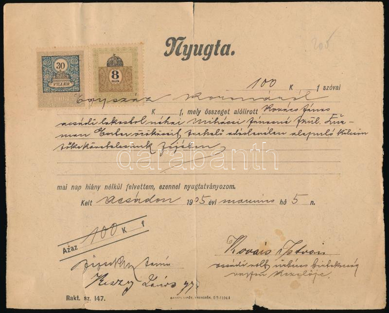 Leírás: 1905 Fizetési nyugta, Acsád, 30 és 8 filléres okmánybélyeggel, kisebb szakadásokkal, aláírásokkal.