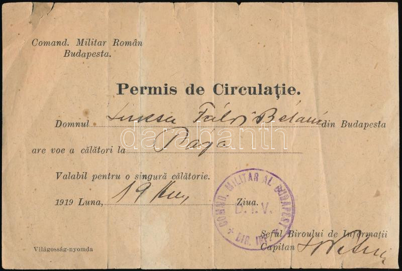 1919 A megszálló román hatóságok által kiállított utazási igazolvány. https://www.darabanth.com/hu/280-Gyorsarveres/280.0/Festmeny-mutargy-papirregiseg-egyeb/Okmanyok~16/1919-A-megszallo-roman-hatosagok-altal-kiallitott-utazasi-igazolvany~II1445260