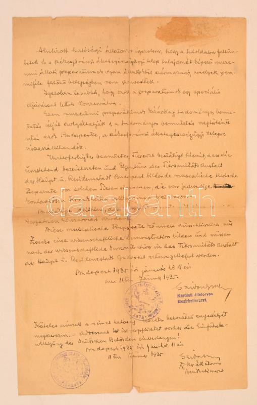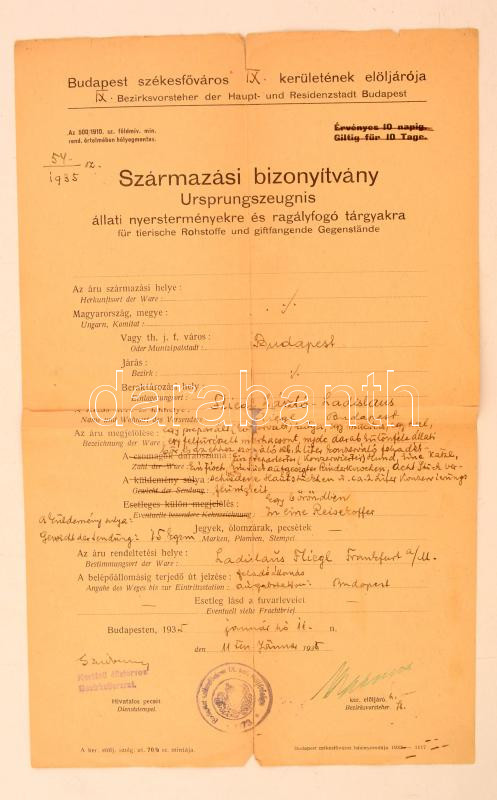 1935 Bp., Budapest székesfőváros IX. kerületének elöljárója által kiál... https://www.darabanth.com/hu/280-Gyorsarveres/280.0/Festmeny-mutargy-papirregiseg-egyeb/Okmanyok~16/1935-Bp-Budapest-szekesfovaros-IX-keruletenek-eloljaroja-altal-kiallitott-szarmazasi~II1445034
