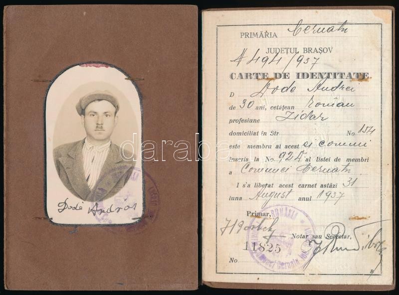 1937 Csernátfalusi (Cernatu) kőműves fényképes személyi igazolványa / ... https://www.darabanth.com/hu/280-Gyorsarveres/280.0/Festmeny-mutargy-papirregiseg-egyeb/Okmanyok~16/1937-Csernatfalusi-Cernatu-komuves-fenykepes-szemelyi-igazolvanya-Brasov-region-stonemaso~II1444852