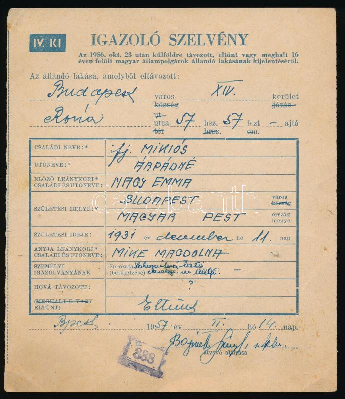 1957 1956. október. 23 után külföldre távozott, eltünt, vagy meghalt 16 éven felüli magyar állampolgárok állandó lakásának kijelentését igazoló szelvény.
