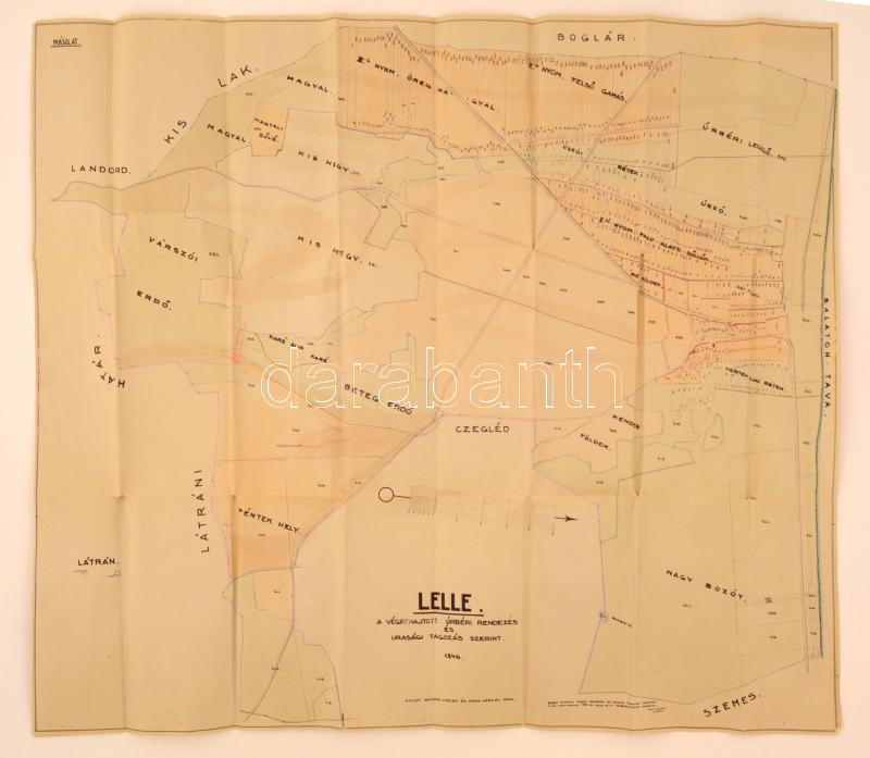 Leírás: (Balaton)Lelle a végrehajtott úrbéri rendezés és urasági tagozás szerint 1846-ban, másolat, szakadással, 84x75 cm