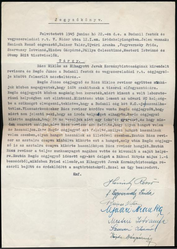 1945 Jegyzőkönyv a Budanil Festék- és Vegyszereladási Rt. és az Elhagyott Javak Kormánybiztosának kirendelt revizora közti szóváltás ügyében, az eset részletes leírásával, aláírásokkal
