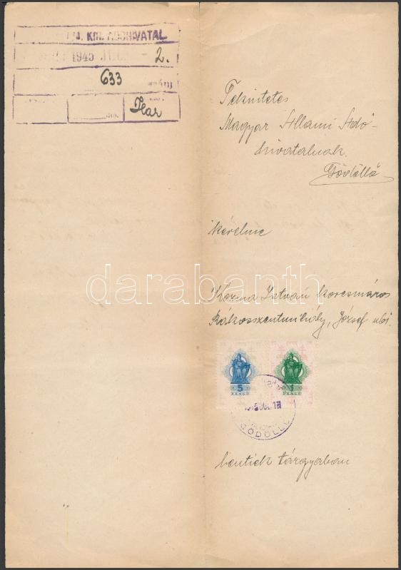 Leírás: 1945 Kozma István rákosszentmihályi kocsmáros kézzel írt kérvényező levele az Adóhivatalhoz, okmánybélyegekkel
