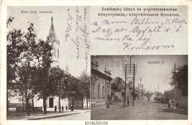 Leírás: Komárom, Komárno; Római katolikus templom, Igmándi út, kiadja Szathmáry könyv és papírkereskedése / church, street (EK)