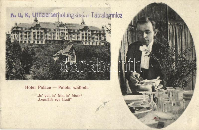 Leírás: Tátralomnic, Tatranska Lomnica; Palota szálloda és tiszti üdülőtelep, Misi a pincér / Palace Hotel with Misi the waiter (vágott / cut)