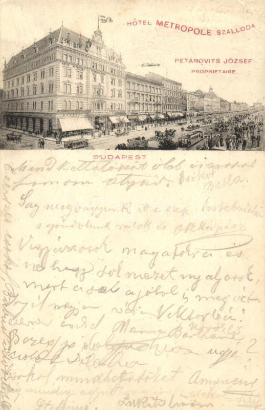 Leírás: Budapest VII. Petánivts József 'Hotel Metropole' szállodája és kávéháza, villamos, kiadja Czettel és Deutch